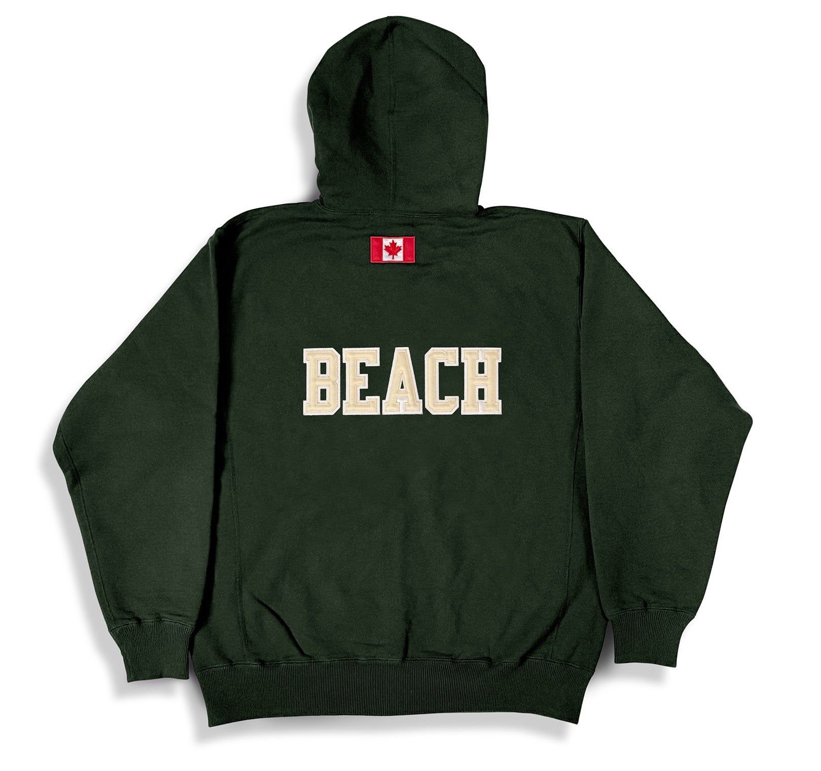 The Beach Full Zip Hoody Park Green with Cream BEACH on back and Canadian Flag on back.