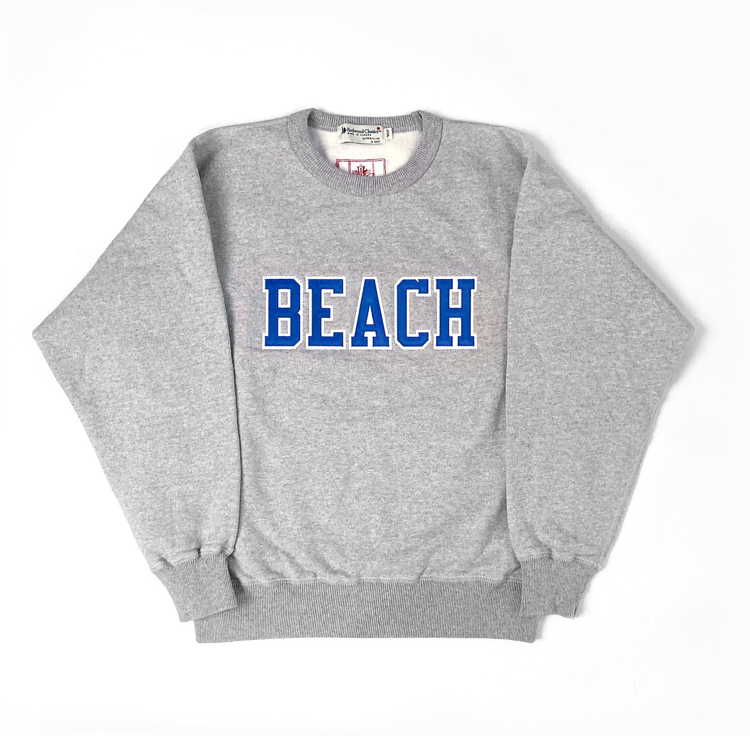The Beach Sweatshirt Grey Sweatshirt with Blue BEACH on front and Canadian Flag on back.