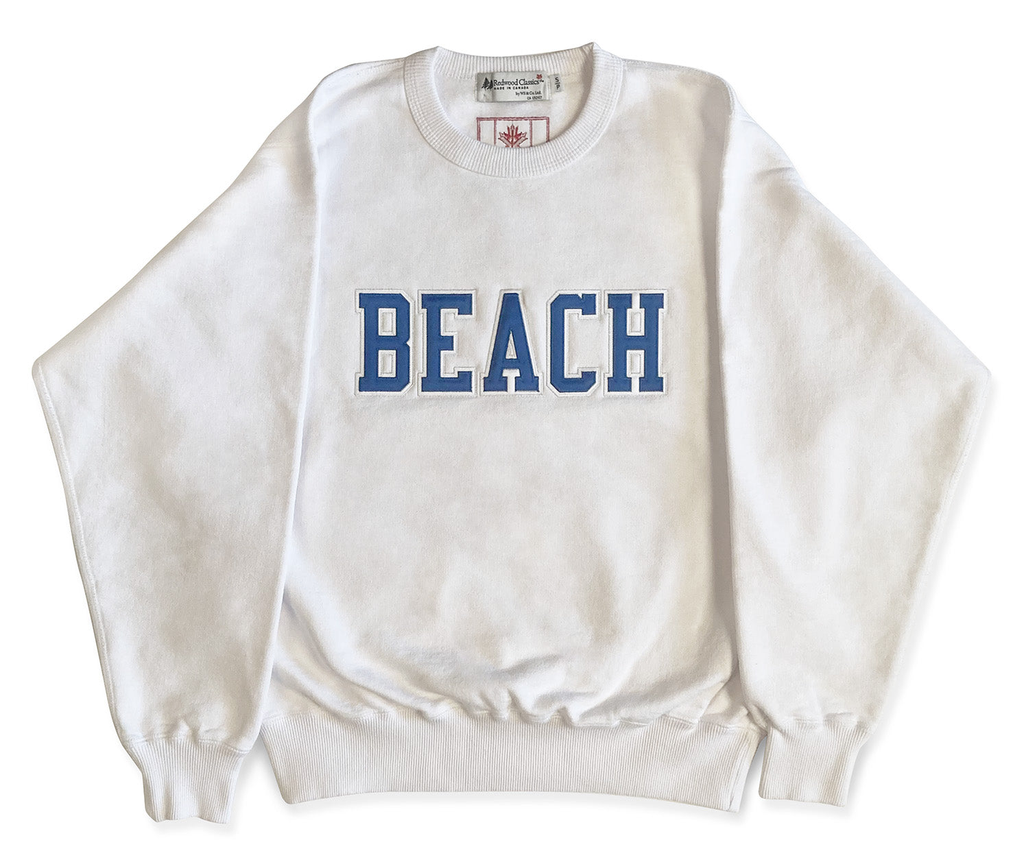 The Beach Sweatshirt White Sweatshirt with Blue BEACH on front and Canadian Flag on back.