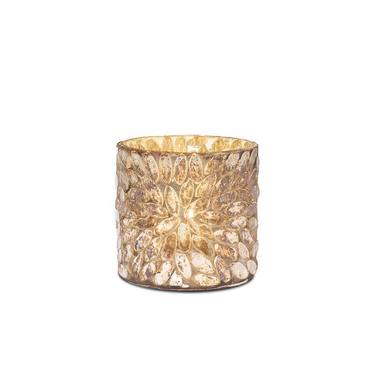 Crafted out of glass, this circular candle holder features a gorgeous gold-tinted mosaic tile pattern to add some unique ambience to any space.