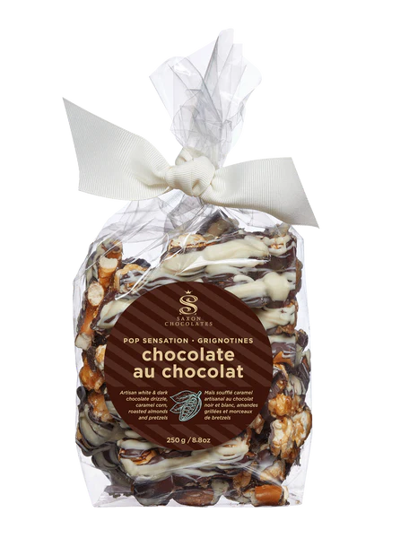 An addictive mixture of caramel popcorn, roasted almonds, and pretzel pieces all drizzled with dark and white chocolate.
