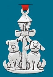 This pewter Dogs @ Lamp post ornament comes with a red satin ribbon.