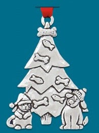 This pewter Dog & Cat sitting by the Christmas tree ornament comes with a red satin ribbon.